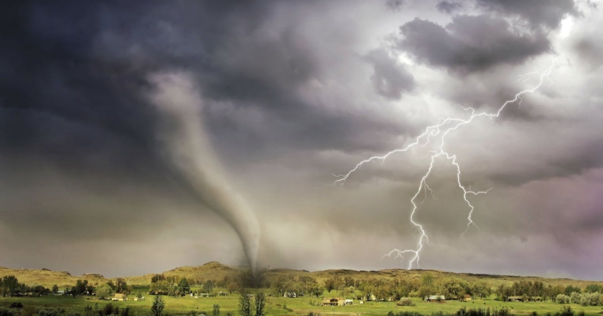 民眾在窗邊拍下驚險一幕,不遠處龍捲風襲來,沿途捲起住宅的屋頂,巨大的龍捲風成漏斗形狀,上半部龐大無比,幾乎遮蔽整片天際。