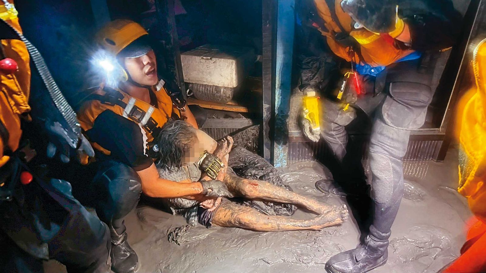 搜救人員進入民宅搜救,一名受困民眾被找到時滿身泥濘。(中央災害應變中心提供)