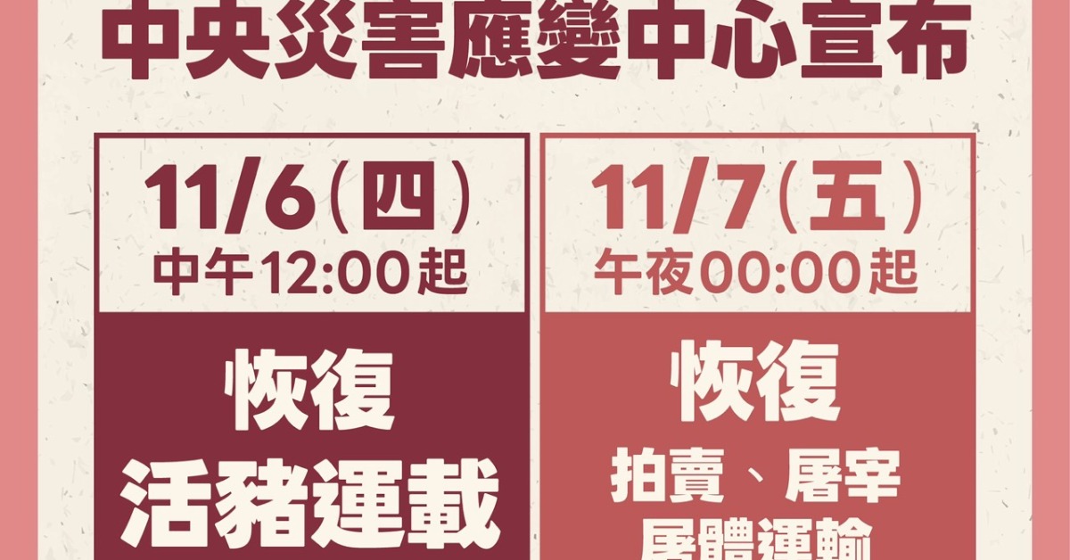 中央災害應變中心揮官陳駿季今天表示,案例場清消之後都是陰性,也沒有第二個案例在其他養豬場發生,也達到了預期的目標,所以中央災害應變中心決定,11月6日12點起先解禁活豬的運輸,7日凌晨開始解禁批發與拍賣屠宰以及屠體的運輸。