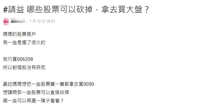 網友表示媽媽想賣股換0050。(圖/翻攝自Dcard)