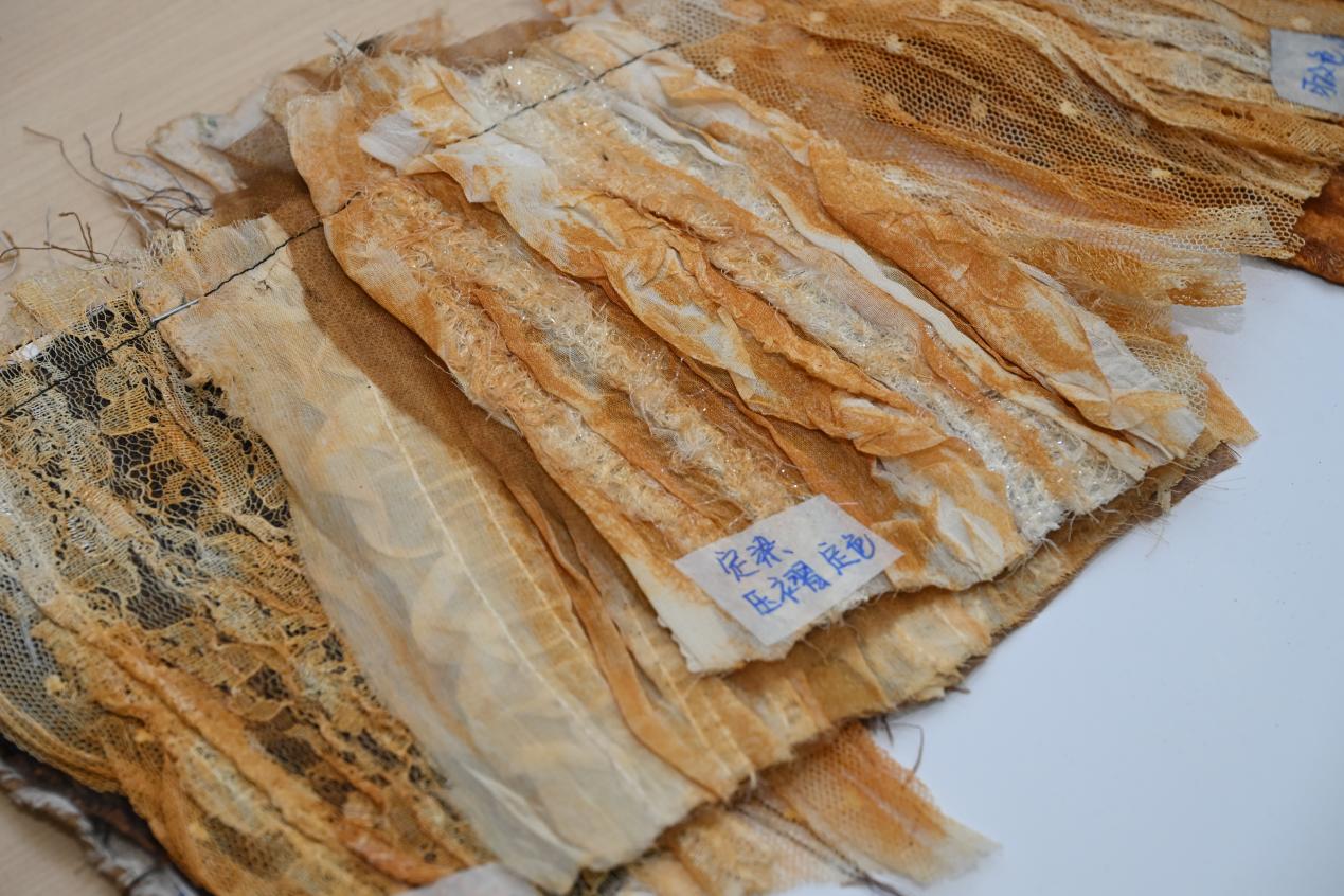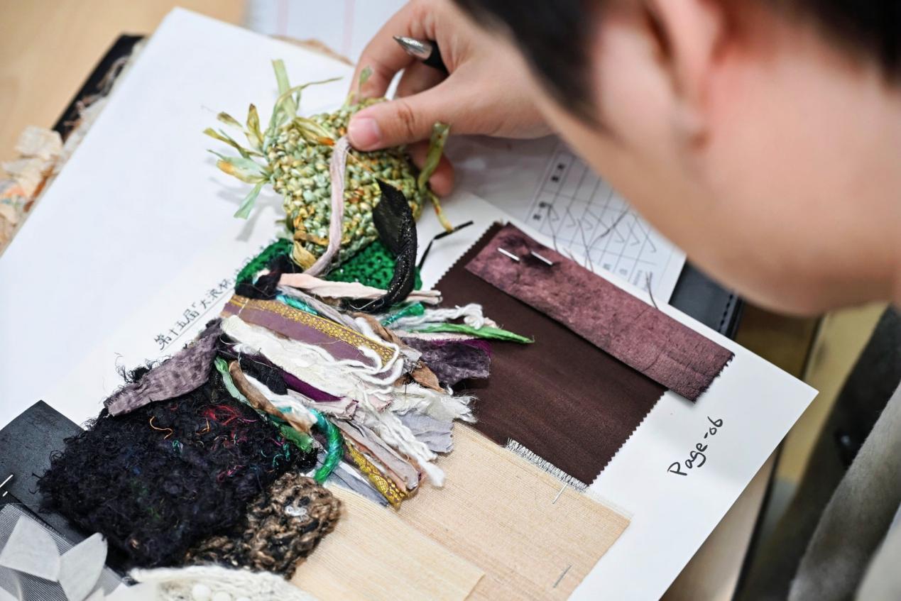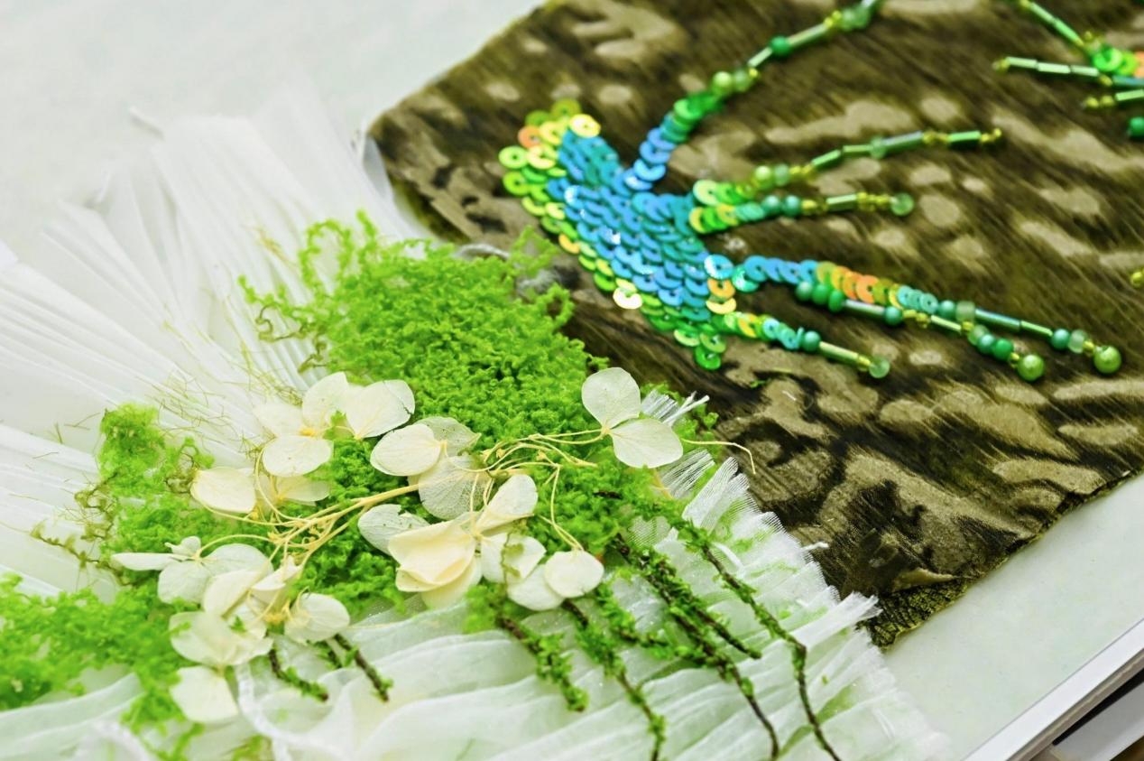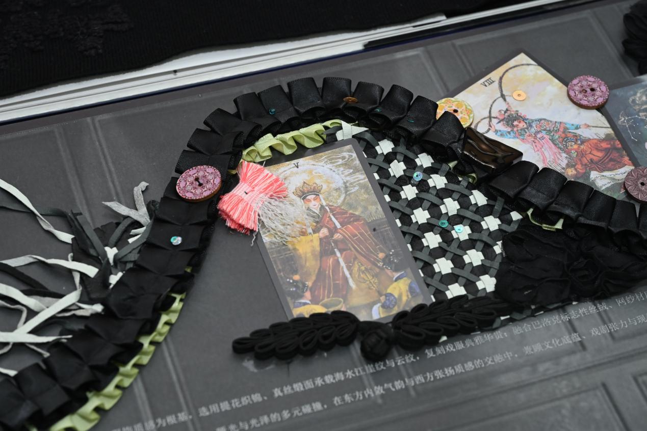 面對非遺傳承與可持續發展,設計師展現了深厚的在地情懷與創新智慧,或秉持“慢時尚”理念探索民族工藝的現代轉化,或利用廢料再造面料詮釋東方雅韻,同時將環保理念貫穿其中。他們利用回收廢棄錫紙結合非遺工藝製作裝飾,傳遞生態守護的願景。此外,還有作品將AI數字美學與東方哲學思想結合,以服裝為畫布捕捉情緒,展現了極具未來感的藝術表達。